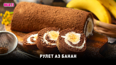 Фалларо бо ду қошуқ шакар ва равған омезиш диҳед. Бананро пӯст карда, ба табақча монеду ба рӯяш фаллаи равғандорро резед. Аз болояш шоколадро резед. Барои омода кардани шоколад, сметанаро бо 1 қошуқ шакар ва какао дар оташ ҷӯшонед. Рулетро бо тарошаи кокос оро диҳед.