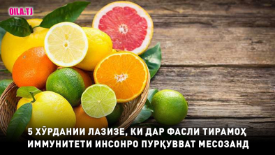 Фасли тирамоҳ қариб ба охир расида истодааст ва ҳаво рӯз то рӯз сардтар мешавад. Бо сабаби тез-тез тағйир ёфтани ҳарорати ҳаво ба осонӣ ба зуком ва бемориҳои тирамоҳию зимистона гирифтор шудан мумкин аст. Дар ин айём ба саломатии худ диққати ҷиддӣ дода, бештар он хӯрданиҳоеро бояд истеъмол намуд, ки системаи муҳофизатии организм-иммунитети инсонро пурқувват месозанд, то ки ҷисм ба муқобили ҳар хел вирусу микробҳо мубориза бурда тавонад. Саломатии худро муҳофизат ва бемориҳои гуногунро пешгирӣ кардан хоҳед, муттаваҷҷеҳ бошед!
