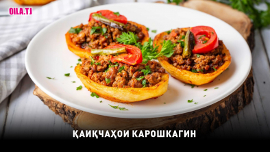 Ба қима намаку мурч илова кунед. Картошкаро пӯст карда, аз байн ду пора кунеду дилаашро бо корд бурида гиред. Ба даруни картошка қимаро пур карда, аз болояш каме равғани маска гузореду ба даруни қолаби пухтупазӣ гузоред ва 150 мл об илова кунед. Қаиқчаҳои картошкагинро муддати 40 дақиқа дар ҳарорати 180 дараҷаи тафдон пазед.