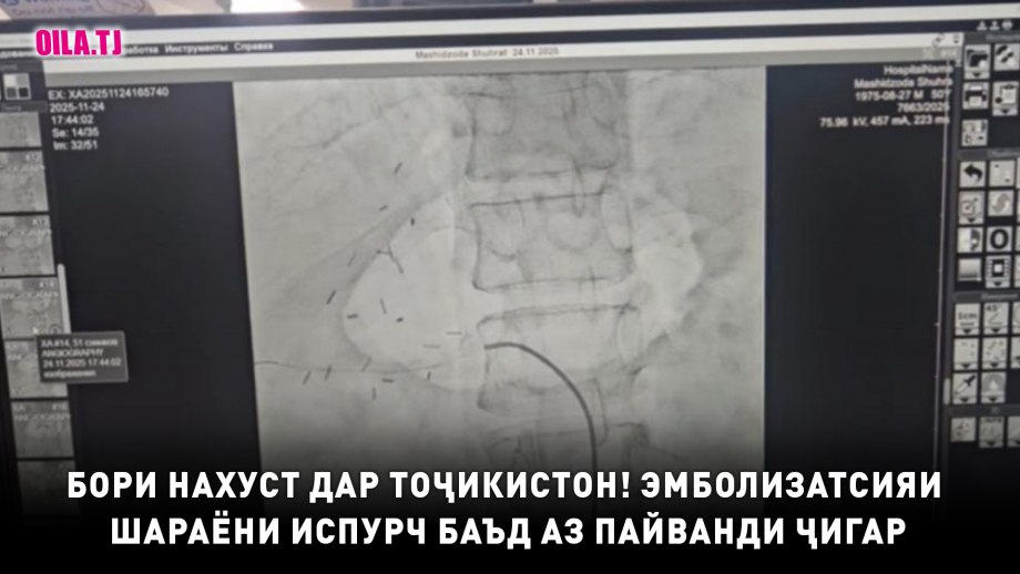 Дар Муассисаи давлатии “Маркази ҷумҳуриявии илмии ҷарроҳии дилу рагҳо”-и Вазорати тандурустӣ ва ҳифзи иҷтимоии аҳолии Ҷумҳурии Тоҷикистон бори аввал дар кишвар ба беморе, ки пайванди ҷигар гузаронидааст, эмболизатсияи шараёни испурч бо муваффақият анҷом дода шуд.