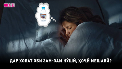 - Шумо бисёр хоби хуб дидаед. Дар хобномаҳо омадааст, ки оби соф дар хоб ба покӣ ишорат мекунад. Махсусан нӯшидани оби зам-зам дар хоб фоли нек аст. Касе хоб бинад, ки дар сарзамини муқаддас нишаста, оби зам-зам нӯшида истодааст, бояд шод шавад, зеро дидани чунин хоб на ба ҳар шахс муяссар мегардад.