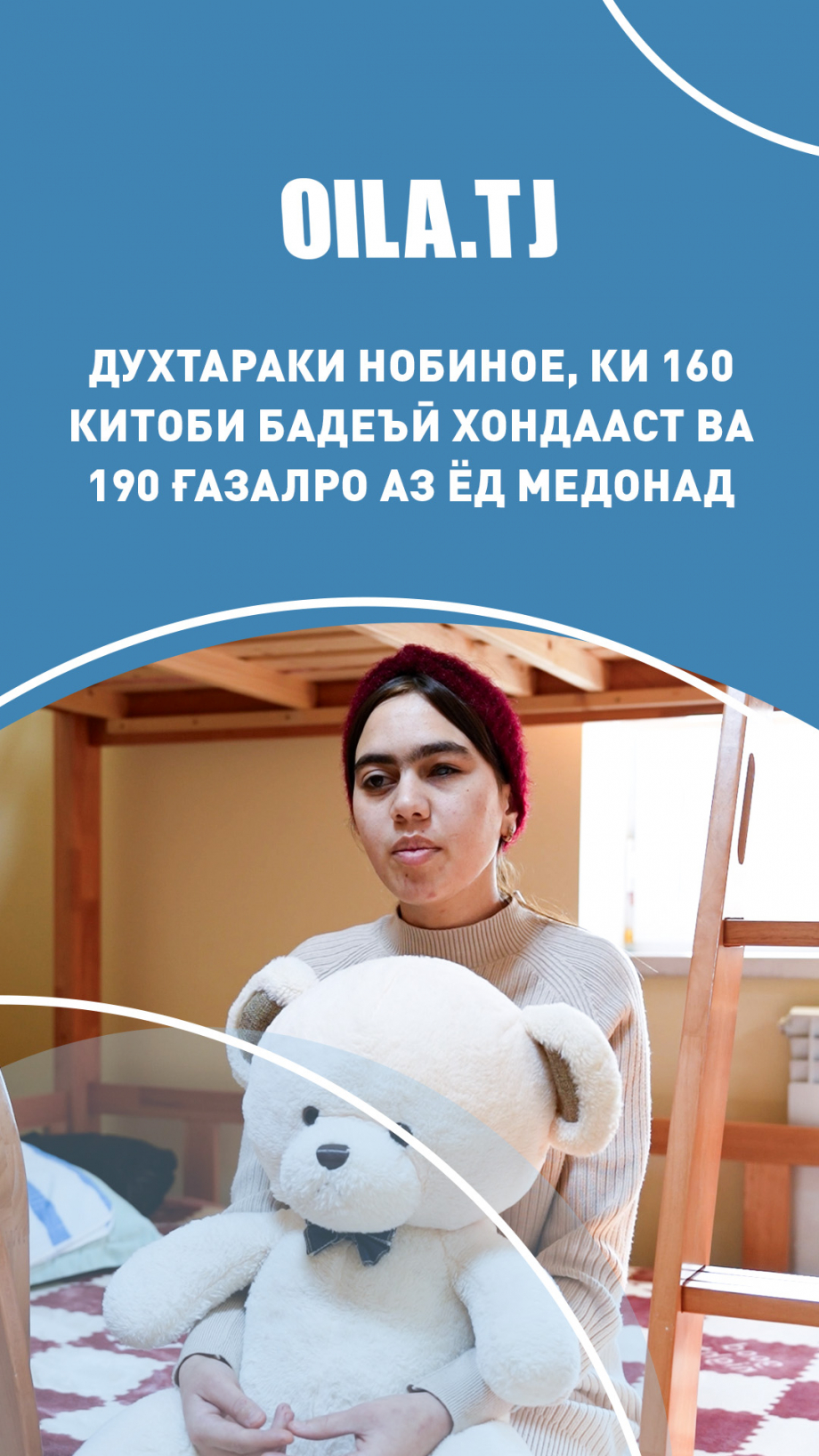 Ба нобиноияш нигоҳ накарда, ин духтараки фарҳангдӯст 160 китоби бадеъиро мутолиа намуда, 190 ғазалро ҳифз кардааст, илова бар ин, порчаҳои алоҳидаро аз достонҳои маъруфи шоирони классик ва муосири тоҷик аз ёд медонад.