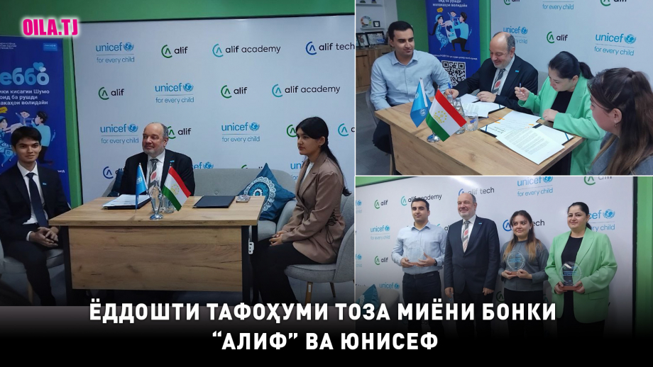 Дар асоси Ёдошти тафоҳуми нав ба имзо расида Бонки “Алиф” ва ЮНИСЕФ уҳдадор мешаванд, ки барои тарғиби усулҳои волидайнии мусбат ва фароҳам овардани дастрасии беҳтари ҷавонон ба малакаҳои рақамӣ, саводи молиявӣ ва омӯзишҳои қобилияти шуғл якҷоя кор кунанд.