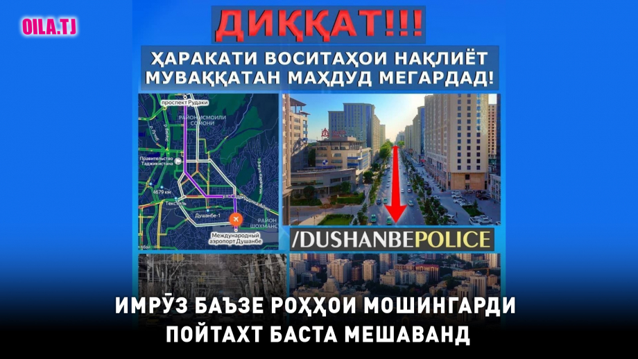 Пулиси Душанбе эълон кардааст, ки имрӯз, 11-уми декабр аз соати 18:00 то соати 20:00 ҳаракати мошинҳо тавассути хиёбони Рӯдакӣ ва кӯчаҳои С. Айнӣ, А. Дониш ва М. Мастонгулов қатъ мегардад.