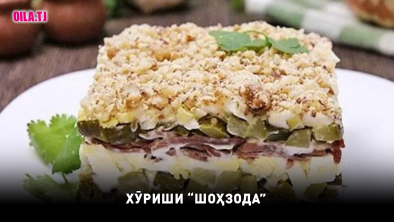 500 грамм гӯшти гов, 4 тухми обпаз, 6 бодиринги очонидашуда, 3 дандона сирпиёз, 1 истакон чормағз, 200 грамм майонез.