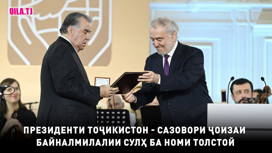 Ба Президенти Ҷумҳурии Тоҷикистон муҳтарам Эмомалӣ Раҳмон дар шаҳри Санкт-Петербурги Русия Ҷоизаи байналмилалии сулҳ ба номи Лев Толстой супурда шуд.