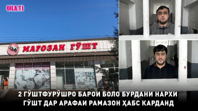 Дар ин бора Раёсати корҳои дохилӣ дар шаҳри Душанбе рӯзи 19-уми феврал хабар дода, гуфтааст, ки Абдулазиз Абдуллоев ва Фирӯзҷони Маҳмадулло бо мақсади ба даст овардани манфиати молиявӣ нархи гӯштро дар “Мағозаи гӯшт”, ки дар кӯчаи Ҷаббор Расулови ноҳияи Сино ҷойгир мебошад, бе асос боло бурдаанд.
