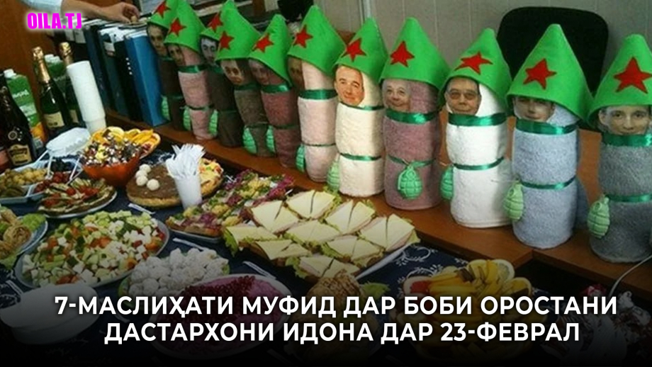 1. Хонумҳои муҳтарам, агар шумо мехохед, ки мардони худро бо дастархони идона ва зиёфати олиҷаноб дар рӯзи 23-феврал шод гардонед, дар рӯйи дастурхонатон танҳо он чизҳоеро гузоред, ки мардҳо дӯст медоранд.