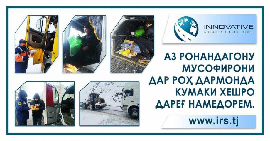 Илова бар ин, аз ҷониби IRS ба ронандагону мусофирони дар роҳ дармонда озуқа тақсим карда мешавад. Кормандони ин ширкат ҳамчунин нисбат ба автомобилҳои дар роҳ дармонда ва ба садама дучоршуда низ бетаваҷҷуҳ нестанд. Хусусан, ҳангоми ба садама дучор шудан бо истифода аз техникаҳои махсус ҳатман онро ба макони лозимӣ мерасонанд. Нависандаи ин сатрҳо ба чунин ҳолат мувоҷеҳ шуда буд. Соле пеш, дар километри 69 ба садама дучор шуда, бидуни техникаи махсус интиқоли автомобил ғайриимкон буд. Ҳангоме ки бо ин мушкилот ба намояндагони филиали Ширкати IRS Тоҷикистон муроҷиат намудам, кормандони он бо дарки масъулият ва муносибати самимона автомобили маро то шаҳри Душанбе оварданд. Ҷоиз ба зикр аст, ки чунин корро ҳар сол кормандони ширкати зикршуда садҳо маротиба иҷро мекунанд.
