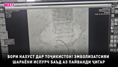 Дар Муассисаи давлатии “Маркази ҷумҳуриявии илмии ҷарроҳии дилу рагҳо”-и Вазорати тандурустӣ ва ҳифзи иҷтимоии аҳолии Ҷумҳурии Тоҷикистон бори аввал дар кишвар ба беморе, ки пайванди ҷигар гузаронидааст, эмболизатсияи шараёни испурч бо муваффақият анҷом дода шуд.