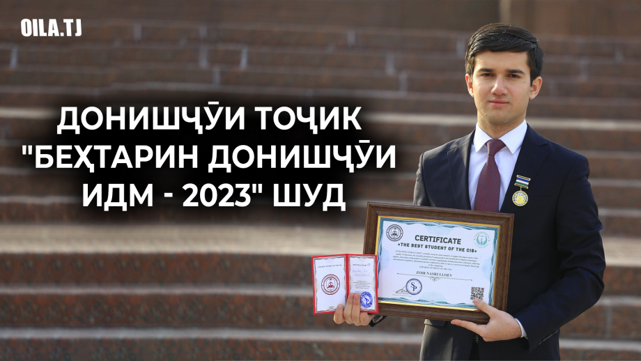 Донишҷӯи курси дуюми Донишгоҳи миллии Тоҷикистон Зоир Насруллоев барандаи ҷоизаи «Беҳтарин донишҷӯи ИДМ-2023» дар бахши илм ва иноватсия гардида, бо дипломи дараҷаи I, шаҳодатнома ва медали сарисинагии «Беҳтарин донишҷӯи ИДМ» мукофотонида шуд. Дар ин хусус худи Зоир ба Оила.ТҶ хабар дод.