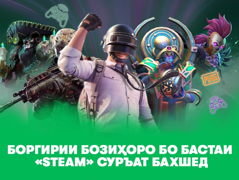 Steam - платформае мебошад, ки дар он зиёда аз 30 000 бозиҳо, аз ҷумла “Counter-Strike 2”, “DOTA-2”, “PUBG”, “Call of Duty”-ро метавон пайдо намуд. Опсияи нав то сатҳи назаррас суръати дастрасиро ба ин манбаъҳо баланд менамояд. Ҳамин тавр, агар бо тарофаи “Барои хона 5 Мбит/с” бастаи “Steam 20”-ро пайваст намоед, суръати интернет барои бозӣ то 20 Мбит/с баланд мешавад, дар вақти шабона бошад, ин нишондиҳанда ба 30 Мби/с баробар хоҳад шуд, яъне суръат шаш баробар зиёд мешавад.