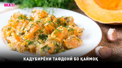 Кадуро аз дилааш тоза карда, хурд реза кунед. Кадуи порашударо дар об муддати 5-6 дақиқа дар оташи паст пазед. Баъдан, обашро полонида, пиёзро реза кунед. Равғанро дар тоба тасфонида, пиёзро бирён кунед. Ба тоба равғани маска молида, кадуро чинеду аз болояш пиёз ва панири аз турбтарош гузаронидашударо пошед. Хӯрокро дар тафдон муддати 15-20 дақиқа, дар ҳарорати 190 дараҷа пазед.