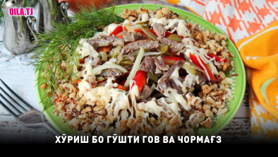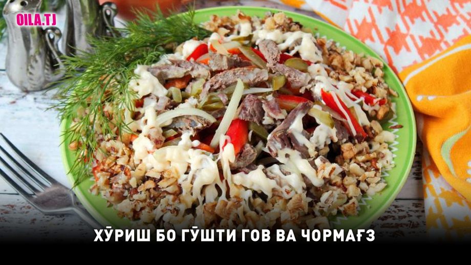 500 грамм гӯшти гов, 4 тухми обпаз, 6 бодиринги очонидашуда, 3 дандона сирпиёз, 1 истакон чормағз, 200 грамм майонез.