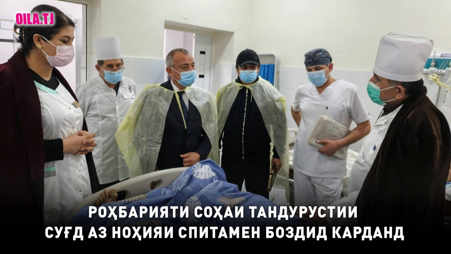 Тибқи дастуру супоришҳои роҳбарияти Вазорати тандурустӣ ва ҳифзи иҷтимоии аҳолии Ҷумҳурии Тоҷикистон, ҷонишини сардори Раёсати тандурустии вилояти Суғд Ҳоҷибоев Маъруфҷон Юсуфҷонович ва директори Маркази назорати давлатии санитарию эпидемиологии вилояти Суғд Раҳмонзода Султон Раҳмон бо мақсади шиносоӣ бо вазъи хизматрасонии тиббӣ, ҳоли беморон ва шароити фароҳамгардидаи муолиҷавию хизматрасонӣ барои онҳо, аз Беморхонаи марказии ноҳияи Спитамен боздид ба амал оварданд.