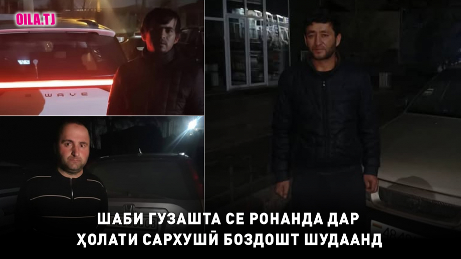 Бино ба иттилои Раёсати ВКД дар шаҳри Душанбе, Наҷмиддинзода Фаридун - ронандаи восиаи нақлиёти тамғаи «BYD», рақамҳои қайди давлатиаш 4305ТТ10, Қамариддинов Аслиддин - ронандаи воситаи нақлиёти тамғаи «Хонда», рақамҳои қайди давлатиаш 0808UQ08 ва Хоҷаев Рустам - ронандаи "Опел", рақамҳои қайди давлатиаш 4848НВ01 дар ҳолати сархушӣ боздошт гардидаанд.